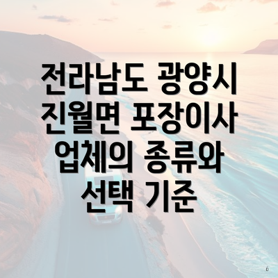 전라남도 광양시 진월면에서 포장이사를 진행할 때, 다양한 이삿짐센터와 업체들의 종류를 이해하는 것이 매우 중요해요. 이는 여러분의 이사 경험을 보다 원활하고 효율적으로 만들어줍니다. 여기서는 포장이사 업체의 종류와 선택 기준을 자세히 설명해드릴게요.